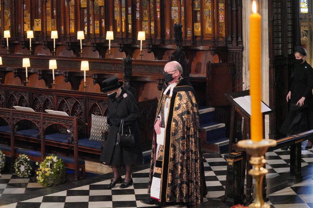 Britain's Queen Elizabeth II (left) is conducted by Dean of Windsor David Conner (second left) into the quire of St George's Chapel for the funeral service of Britain's Prince Philip, Duke of Edinburgh in Windsor Castle in Windsor, west of London, on April 17, 2021. Philip, who was married to Queen Elizabeth II for 73 years, died on April 9 aged 99 just weeks after a month-long stay in hospital for treatment to a heart condition and an infection. (AFP/Dominic Lipinski)