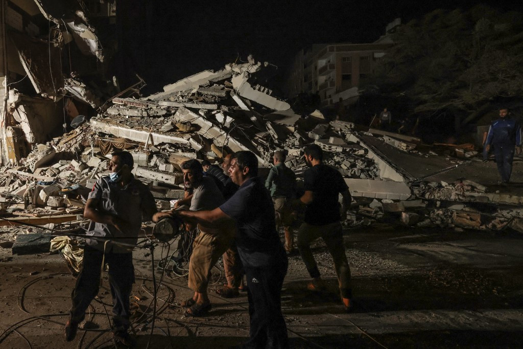 Palestinian firefighters search urgently for survivors and bodies under the rubble after an intensive civilian bombardment of Gaza City, 16 May 2021. Israel pummelled the Gaza Strip with air strikes, killing 10 members of an extended family and demolishing a building housing international media outlets, as Palestinian militants fired back barrages of rockets. (AFP/Mohammed Abed)