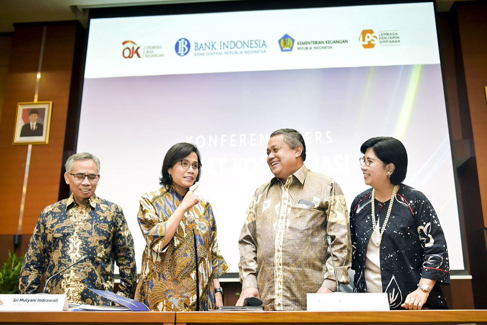 Finance Minister Sri Mulyani (second left) talks with Bank Indonesia Governor Perry Warjiyo (second right), Financial Services Authority board of commissioners chairman Wimboh Santoso (left) and Indonesian Deposit Insurance commissioner Destry Damayanti after addressing the media on economic conditions in Jakarta.