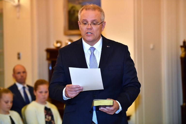 New Australian Prime Minister Scott Morrison takes part in an oath-taking ceremony to become the nation's new leader at Government House in Canberra on August 24, 2018. Scott Morrison was sworn in as Australia's seventh prime minister in 11 years on August 24 after a stunning party revolt against Malcolm Turnbull, which the new leader admitted had left the government (AFP/Saeed Khan)