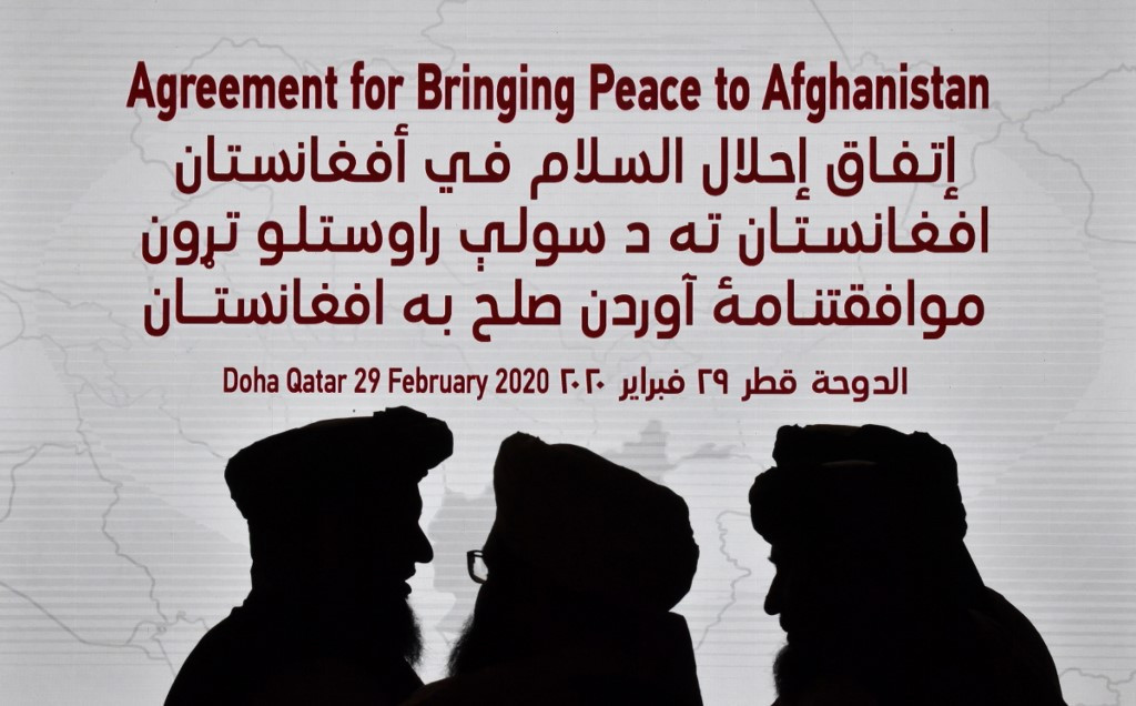 Members of the Taliban delegation gather ahead of the signing ceremony with the United States in the Qatari capital Doha, on February 29, 2020. - Washington and the Taliban are set to sign a landmark deal in Doha that would see them agree to the withdrawal of thousands of US troops from Afghanistan in return for insurgent guarantees. (Photo by Giuseppe CACACE / AFP) (AFP/Giuseppe CACACE)
