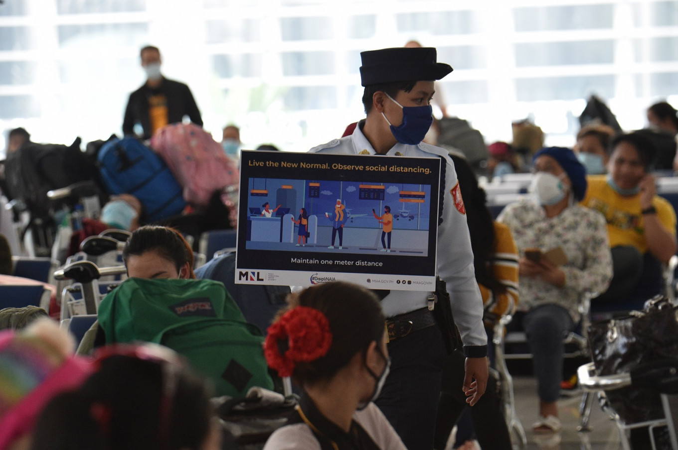 A security guard holding a placard reminding people of social distancing walks past Philippine overseas workers who were quarantined for weeks after returning home as they wait for flights back to their home cities around the country, at Manila's international airport on May 28, 2020. (AFP/Ted Aljibe)