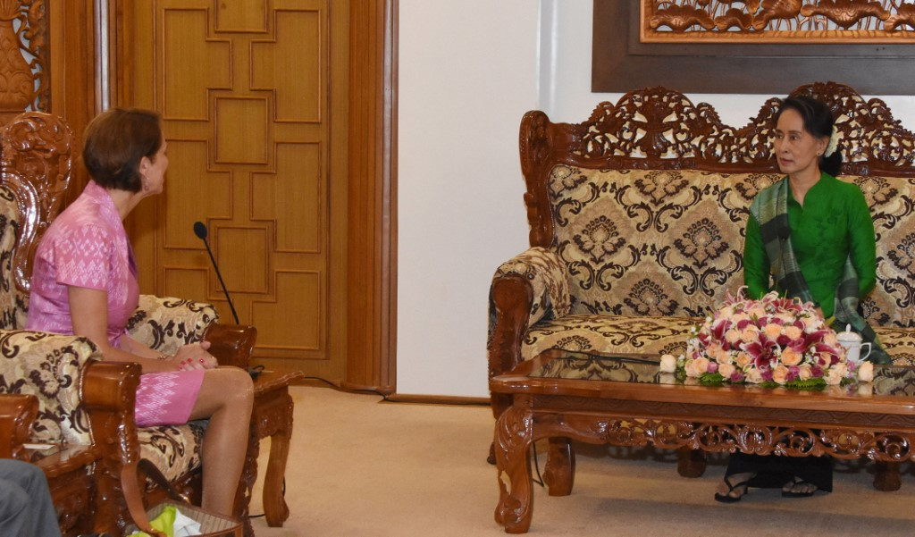 This handout picture released and taken by the Ministry of Information on June 13, 2018 shows Myanmar State Counsellor Aung San Suu Kyi (right) receiving new UN envoy Christine Schraner Burgener (left) during a courtesy call at the Ministry of Foreign Affairs in Naypyidaw on June 13, 2018.
