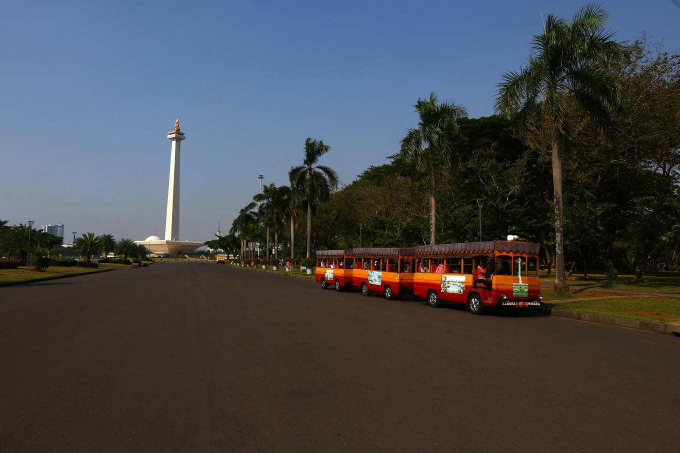 In order to enter the Monas area, you need to walk pass through the Lenggang Jakarta food court. You will find a small bus stop for a free tourist train (kereta wisata) for people who want to directly visit the monument and vice versa.