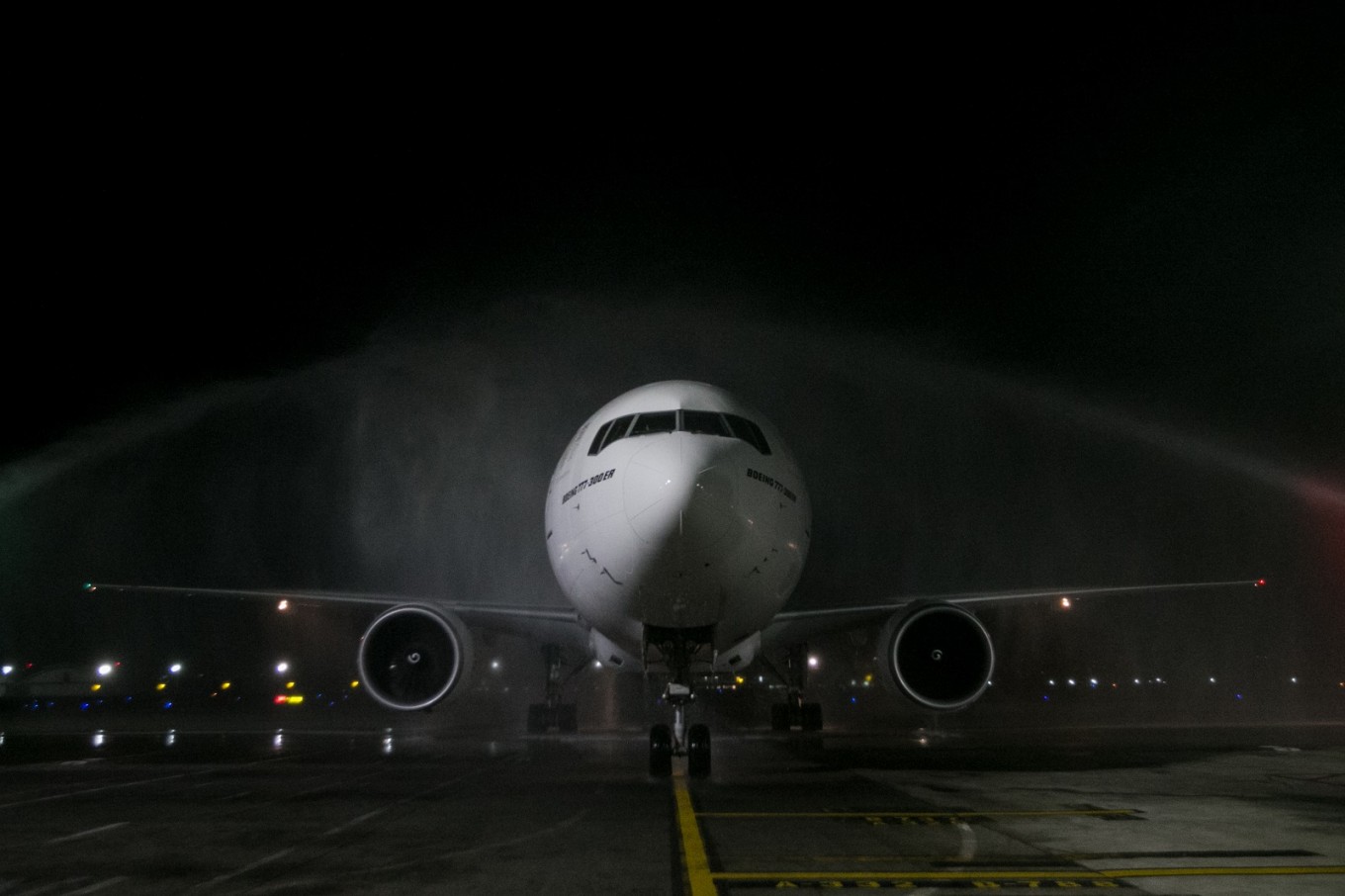 The inaugural flight is greeted with a water salute at the Auckland airport. (JP/File)Reflecting a rising interest in the Indonesian island destination and improving connectivity to New Zealand, the new service uses a 777-300ER, offering eight seats in first class, 42 in business and 304 in economy, as well as a 20-ton capacity of belly-hold cargo.