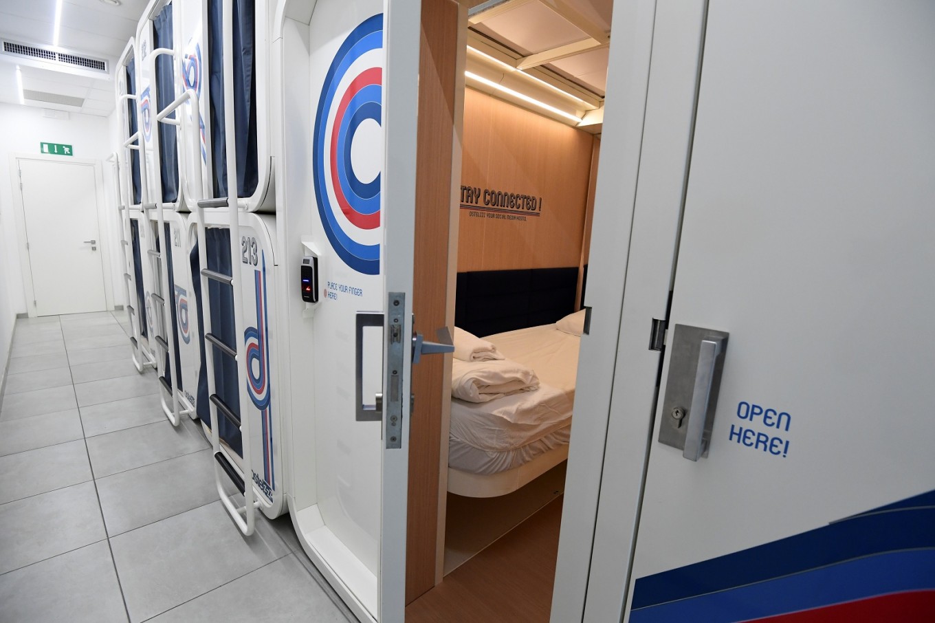 Inside the capsule is a mattress with duvet and pillow, two charging plugs for mobile phone or laptop, a lockable cupboard for luggage and a bedside table.
