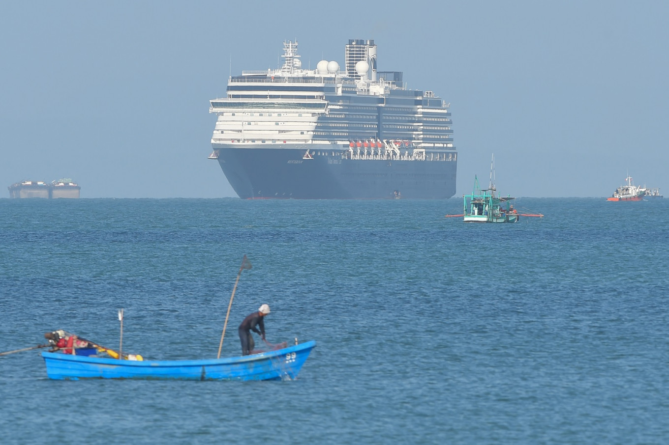The Westerdam cruise ship is seen past fishing boats as it approaches port in Sihanoukville, Cambodia's southern coast on February 13, 2020, where the liner had received permission to dock after been refused entry at other Asian ports due to fears of the COVID-19 coronavirus. Japan, Guam, the Philippines, Taiwan and Thailand all refused to allow the ship to dock, despite operator Holland America insisting there were no cases of the deadly disease -- which has killed over 1,100 -- on board.