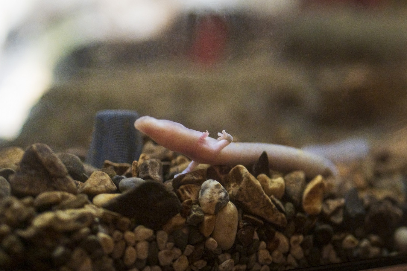 Sometimes also referred to as "human fish", the slim vertebrate sports three feathery gills on each side of its elongated snout. The body's sheer pink skin makes it easy to spot the internal organs.