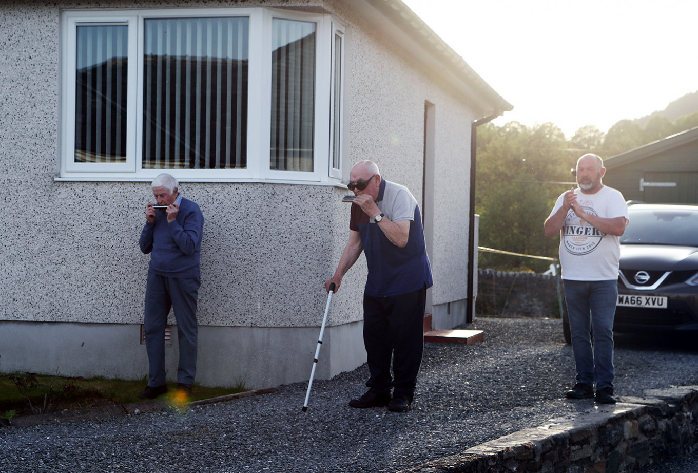 People react outside their homes during the last day of the Clap for our Carers campaign in support of the NHS, following the outbreak of the COVID-19, Pitlochry, Scotland, Britain, May 28, 2020.Travellers from Spain and Serbia will still have to self-isolate if they travel to Scotland, the devolved government in Edinburgh said on Wednesday, despite a previous UK government lifting of restrictions. (REUTERS/Russell Cheyne)