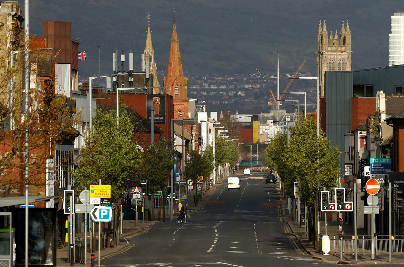 Newtownards Road is seen almost empty at rush hour, as the spread of the COVID-19 continues, Belfast, Northern Ireland, April 13, 2020.Northern Ireland on Friday will drop quarantine requirements for people travelling to it from the same 50 countries that England has exempted, a spokesman for Northern Ireland's health department said on Thursday.