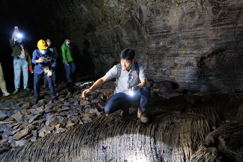 “Even after a while, your eyes will not get used to this darkness, because there is no light at all here,” Ki said. Manjanggul is a 7.4-kilometer-long cave created by basalt lava flows on Jeju Island.