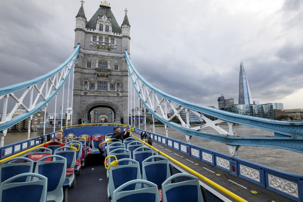 A man takes pictures on Tower Bridge from the near empty top of an open top tourist tour bus in central London on August 24, 2020. (AFP/Tolga Akmen)Although he doesn't wear them himself, he advises the tourists to wear masks and gloves before they set off through the once-gloomy alleyways of Victorian-era London.