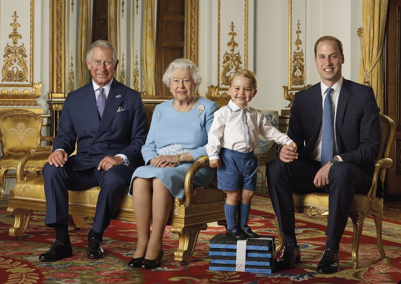 In this image released by the Royal Mail on Wednesday April 20, 2016, Britain's Prince George stands on foam blocks during a photo shoot for the Royal Mail in the summer of 2015 in the White Drawing Room at Buckingham Palace in London for a stamp sheet to mark the 90th birthday of Britain's Queen Elizabeth II. The image features four generations of the Royal family, from left, Prince Charles, Queen Elizabeth II, Prince George and Prince William, the Duke of Cambridge. (Royal Mail via AP/Ranald Mackechnie)