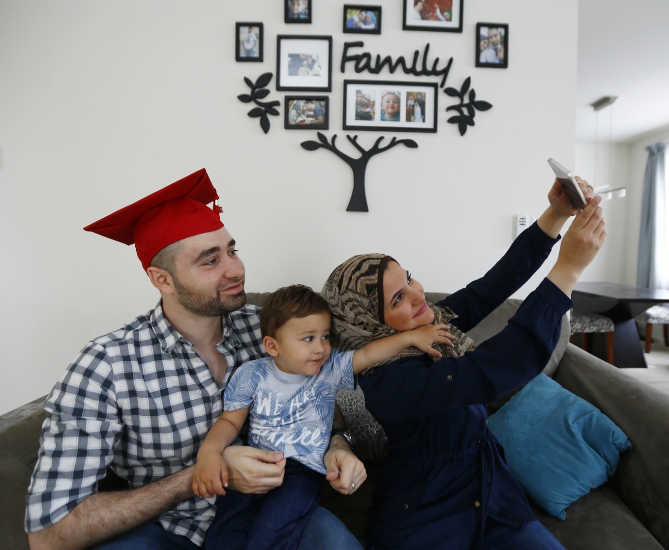 In a photo taken Saturday, May 21, 2016, Mohamad Bassel Khair, left, holds his son, Sami Kahir, 2, as his wife Lama Alassil takes a photo of them to post on the Snapchat application during a photo session with The Associated Press in his home in Clifton, N.J. Khair, of Damascus, Syria, is graduating from New Jersey's Montclair State University with a master’s in nutrition and food science and is now seeking asylum in the U.S. for his family. “They gave me a full scholarship, including rooming,” Khair said. “They were so helpful for me.” (AP/Julio Cortez)