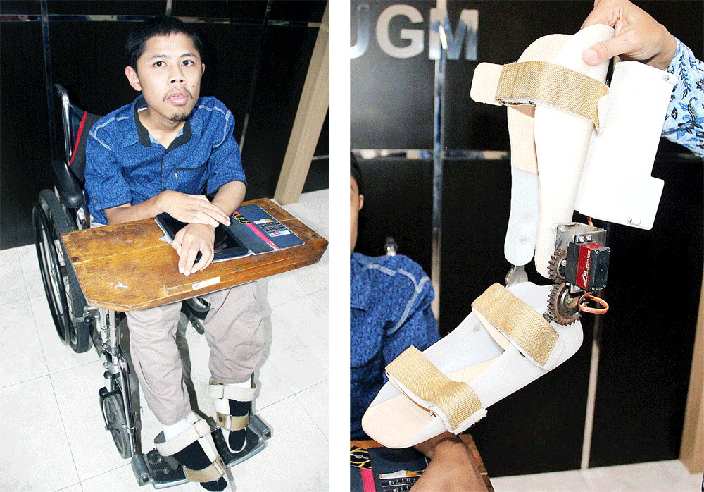 Breakthrough: Muhammad “Fahmi” Husaen poses with his invention, AVEO (Achilles Physiotherapy Orthosis) as shown in a close-up position on the right photo. The computer program and information systems student at Gadjah Mada University will showcase his invention in South Korea this month. (Courtesy of Erlinawati Graham/-)